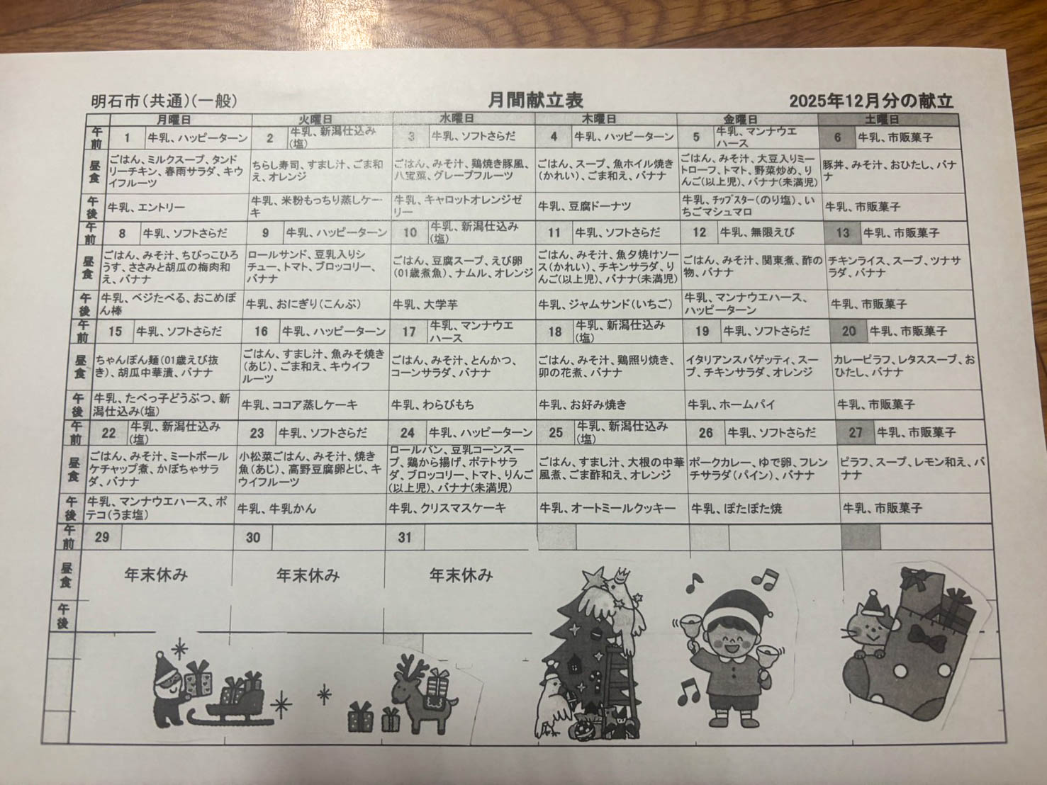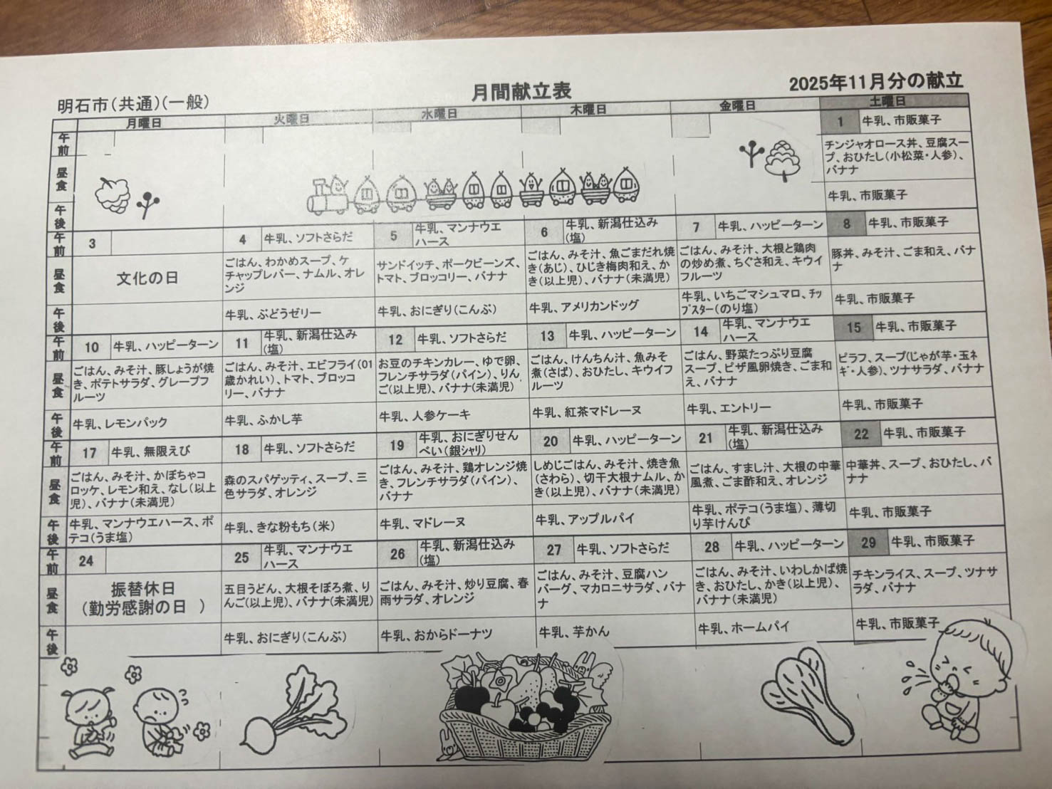 すくすく保育園の給食は、お子様の健康面を考え、明石市のこども育成室の献立表にもとづいて作っております。